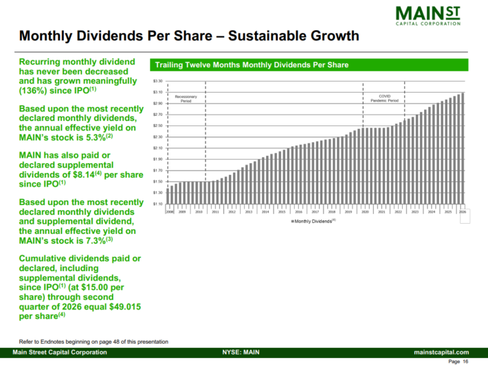 MAIN verse un dividende mensuel. La société a également versé à plusieurs reprises des dividendes supplémentaires substantiels. L’exemple le plus récent est un paiement supplémentaire de 0,30 $ par motion déclaré le 26 février 2026.